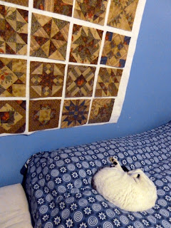 My design wall is a piece of thick cheap wadding from Dunelm Mill which has been tacked to the wall. Gizmo likes to have a snooze whilst contemplating the layout of the blocks!